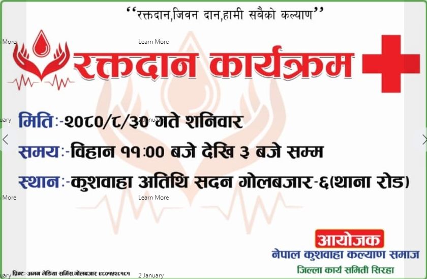 मिती २०८० मंसीर ३० गते कुशवाहा अतिथी सदन गोलबजार मा भएको रक्तदान कार्यक्रम